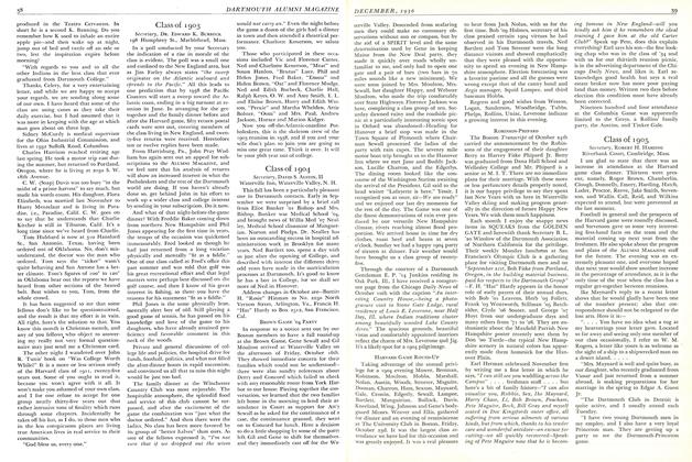 The first item out of the mail bag this month is a beautiful postcard showing many multicolored gondolas in a regatta on Venice's Grand Canal, mailed some weeks back by Dick Butterfield. He wrote, "I am just winding up another two-week stay in this beautiful city, working on one of my favorite projects. This on top of a week in London pursuing my Christopher Wren project." Dick returned in time for the 1930 Seminar Room dedication in Hanover at reunion.