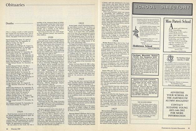 Bear, Robert M., faculty, June 10, 1982 Bouchard, Adrian N., administration, June 25 Weinz, Arthur G. '09, May 2 Hope, Carl A. 'll, May 30 Osgood, Ernest S. '12, June 22 Dunbar, Victor Y. '13, July 6 Humphries, Alfred E: '14, March 19 Lowell, Henry O. '14, May 11 Bull, Albert S. 'l5, May 24 Emery, Arthur L. '16, May 28 Leavitt, Leslie W. '16, July 2 White, John W. '17, May 15 Flower, Ludlow '18, April 7 Brotherhood, John O. '20, June 28 Russell, J. Almus '20, June 25 Hart, Richard H. '21, May 12 Miner, Reginald B. '21, May 26 Symmes, Chandler W. '21, June 30 Valentine, Andrus T. '21, January 23 Johnson, Howard C. '22, May 19, 1979 Hudson, Henry W. Jr. '23, July 4 Smith, Robert A. '23, April 8 Bubier, Kennard F. '24, July 2 Hess, Richard D. '24, April 1983 Shvetzoff, Dimitri A. '24, May 9 Antrim, Joel P. '25, May 9 Luten, Granville H. '25, June 20 Matthews, Daniel J. '25, May 27 Spring, John D. '25, April 10 Torrens, Robert W. '25, November 22, 1982 Church, Donald E. '26, May 22 Harwood, Herbert H. '26, June 6 Minuse, Thomas B. '26, May 20 Whitney, Vernon E. '27, June 25 Stone, Fred L. '28, May 1983 Humphrey, Otis M. '30, July 4 Lynch, Edward K. '30, May 23 Burrill, Roger H. '31, June 3 Cunningham, John F. Jr. '31, May 14 Glass, Hubert D. '31, April 6 Langenbach, Edward R. '31, June 22 McElroy, James F. '31, June 8 D'Arcy, Donald F. '33, July 4 McCoy, Byron O. '33, May 14 Noonan, Thomas B. '33, June 21 White, Alfred H. '33, July 1 Wilson, Howard W. '33, March 13 Mills, Clifford W. '35, May 27 Peirce, James D. Jr. '35, March 1983 England, Clifford W. '36, May 13 Prime, Wilbur H. '37, Date Unknown Young, John Jr. '37, Spring 1983 Richman, Robert B. '39, July 19 Michel, Frederick H. '40, January 16 Power, William F. '41, July 9 Thomas, Eugene B. Jr. '42, October 23, 1981 Kulawik, SigmundJ. '44, April 14 Thornton, Joseph R. '44, May 1983 Nelb, Robert G. '45, May 13 Weaver, Joseph H. Jr. '45, September 2, 1977 MacNamee, D. Hugh '46, July 3 Clark, Wallace C. '47, May 25 Marks, Barry A. '47, July 18 Brewer, John N. '49, March 1983 Sullivan, Daniel F. '49, May 30 O'Rourke, Thomas N. Jr. '56, May 27 Renn, Robert A. '57, May 16 Henander, James A. '59, June 3 Leander, John T. '59, July 18 Pullen, David J. '61, May 25 Blan, William H. Jr. '66, August 1 Gaudet, Thomas J. '81, May 30