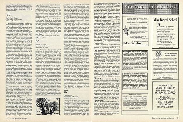 First off, I have important reunion news to pass along. The theme of the class of 1987's 5th Reunion is "Going for the Green" (hint: next year is an Olympic year), and it will take place June 18-21, 1992. So, mark your calendar, pack your bags, tell your neighbors, hold your mail, bring your family, count your blessings, watch your step, write your congressman, and find someone to feed the dog, because this will be the mother of all reunions!