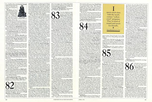 Back on the East Coast, Lisa Brody is practicing law in Philadelphia. She and her husband just became parents to a baby girl. Peter Charbonnier returned to law school at University of Connecticut in 1988 and recently joined Waller, Smith, and Palmer in New London, Conn. Peter told me that Dan Becker is out in Seattle now working for "some government entity." (Dan, Dartmouth has an old number for you, so I couldn't confirm what government entity.)