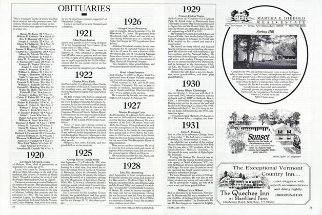 Charles M. Ashton '20 • Mar. 22, 1986 Sherman F. Haight '21 • Apr. 28 Joseph R. Brown '22 • Mar. 16 Henry S. Oliver '22 'June 3 Harold E. Burnham '22 • Apr. 9 Richard C. Litchfield '22 • May 10 Thomas P. Chambers '23 • Mar. 26 George D. Goodyear '23 • Apr. 7 Cecil F. Gordon '23 • Apr. 23 Robert S. Hayes '24 • Apr. 9 Marcellus Newell Joslyn '24 • Aug. 18 Stephen Chase Jr. '25 • Apr. 25 Robert W. Pierce '25 • Mar. 22 Norman Strickland '25 • Nov 23, 1992 William F. Pitney '26 • Mar. 15 Lester Talbot '26 • June 9 Kenneth C. Ballantyne '27 • May 5 Lawrence W. Scammon '27 • May 24 Harry B. Davis '28 • May 4 Creighton C. Hart '28 • Mar. 1 Lawrence H. Martin '28 • Feb. 27 John E. Pelton '28 • Nov. 14 Steele C. Smith '28 • Mar. 28 Richard S. Burke '29 • Apr. 24 Philip E. Hoffman '29 • June 6 George D. Garrett, Jr. '30 • Oct. 9 Richard A. Parker '30 'June 3 John T. Smith '30 • May 5 Stanley R. Swanson '30 • May 26 Barney Ash '31 • Apr. 21 Frederic S. Burkhardt '31 • Mar. 7 John J. Goodwillie '31 • Mar. 28 Wilbur R. Light '31 • Sept. 10 Malcom W. Metcalf '32 • May 5 Carlton J. Ward '32 • May 26 Gerard Henry Dericks '33 • Apr. 16 Douglas B. Field '33 • Apr. 15 Harvey S. Hopkins '33 • May 18 Thomas Maskilieson '33 • Mar. 26 Flamen Ball Jr. '34 • Mar. 1993 James A. Dunn '34 • Apr. 21 Henry S. Stearns Jr. '34 • July 1992 James C. Averill '35 • Dec. 15 Ellwood F. Curtis '35 • Mar. 23 Charles L. Haussermann Jr. '35 • May 1 James S. Zieman '35 • June 9 Curtis C. Comstock '36 • May 4 Horace D. Houghton '36 • Apr. 28 Gordon S. Spencer '35 • Apr. 12 Robert S. Martin '36 • Dec. 24 Robinson Bosworth '37 • Apr. 19 Donald H. Frank '37 • Apr. 1 Thomas G. O'Brien Jr. '37 • Apr. 10 Emery W. Patterson '37 • May 1 Conant H. Barton '38 • Mar. 30 Duncan Buttrick '38 • Apr. 1 James E. Hastings '38 'June 11 Paul B. Urion '38 • May 1993 William B. Andrus '39 • Sept. 5, 1991 Robert C. English '39 • Feb. 19 John S. Haley '39 • Feb. 24 William A. Mac Donald '39 • Feb. 18 William R. Grimshaw Jr. '40 • May 12 Robert K. Joslin '40 • Apr. 11 Alfred D. Becker Jr. '41 • Dec. 10 Daniel P. McMullen '41 • Mar. 9 Edward O. Tabor '41 • Apr. 14 Philip J. Blood '42 • Feb. 1993 Arthur M. Cox '42 • Apr. 29 Carroll Henry Woods '42 • Apr. 21 Edward A. O'Brien '43 • Apr. 16 Fred E. Woodward '43 • Mar. 25 Richard M. Berlin '44 • Feb. 9 Frederick H. Brandenburg '44 • Apr. 8 Tony E. Foster '44 • Apr. 12 Henry W. Hughes '44 • Apr. 27 Richard M. Kerwin '44 • May 9 Richard E. Mayberry '44 • May 2 George E. Recke '44 • May 17 Donald M. Smith Jr. '44 • Mar. 14 George S. Springsteen '44 • Apr. 24 Peter D. Weston '44 • Jan. 13 Wilfred J. Rinkor '45 • Jan. 20 David H. Blankenhorn '46 • May 9 Duncan L. Gibson '46 • Apr. 12 John H. Kornblith '46 • July 27 Donald J. Anderson '49 • Dec. 1992 Robert H. Treat '49 • May 3 Robert Jordan '50 • May 28 John P. Mernan '51 • Jan. 7 Donald G. Neill '51 • Mar. 17, 1992 Henry S. Robinson '51 • Apr. 27 Peter A. Van Orden '51 • Feb. 1993 William H. Bartlett '52 • Mar. 6 David L. Berry '53 • May 4 Joshua T. Griffith '53 • Aug. 1992 Robert L. Jetter '53 • Mar. 1993 John D. Senne Jr. '53 • May 23 George D. Voss '54 • May 6 Carl H. Marshall '56 • Apr. 15 Frank M. Andrews '57 • Dec 23 Bruce L. Paule '57 • Mar. 24 David G. Rattray '57 • Mar. 22 Rolf H. VonEckartsberg '58 • Apr. 29 John R. Hoyne '60 • May 20 Roy F. Monson '60 • May 1 Thomas G. Troyer '60 • Mar. 13 Alvin R. Martin III '65 • Mar. 1993 Dania T. Mazpule '89 " June 5