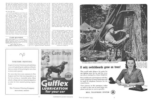 The review of Dartmouth skiing ["Dartmouth Undying," March] interested me because I attended the national downhill race on Mt. Moosilauke in February 1933. Ford Sayre '33, a fraternity brother of mine at Phi Gam, needed a few men to patrol the race. Although I was not a skier, I volunteered. Five of us left Hanover and reached the base of the mountain at noon; the temperature was zero. The winds at the top of the mountain were very strong, so Fordie said we would have to wait until evening, when he hoped they would die down. About ten o'clock that night we started up the carriage road, snakeskins. on our skis, and we made good progress until we reached a spot above the tree line. Fordie told us to take off our skis and we would follow him to the winter cabin. I remember taking off my mittens to unfasten my skis and I didn't think I could get them back on my hands were so cold. It was pitch black, the winds strong, 40 degrees below zero, and I was very scared. Fordie had spent several summers on the mountain so he knew every inch of the way. Single file we followed on our hands and knees; after 300 yards we were finally safe in the tiny winter cabin. The stove was started, plenty of blankets and food found. I can tell you it was a great relief to be there.