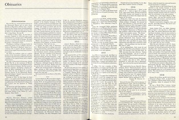 Trumbull "Trum" Huntington died February 3. He attended Dartmouth for two years and was active in the Glee Club, Cabin & Trail and Theta Delta Chi. He was in the Air Force in WWII as lead navigator for the squadron. During the years 1953 to 1976 Trum lived in Middletown, Connecticut, and established Huntington's Book Stores. After moving to Orleans, Massachusetts, he started the publishing company Parnassus Imprints, specializing in books about Cape Cod. He also served as president of the American Booksellers Association. His wife, Carol, died in 2000. He is survived by daughters Emily, Mary and Constance. Ward S. Jenkins, M.D., died october 31, 2007. He is survived by sons Stephen '68 and Wallace. He was active in the Glee Club and Foley House. Ward started medical school at DMS in 1941, completed in M.D. at Yale and joined the Army Medical Corps. In 1948 he moved to Salem, New York, and was in general practice for eight years. He moved to Boston, studied allergy at Lahey Clinic, joined the Toledo Clinic in 1958 and practiced allergy there until his retirement.