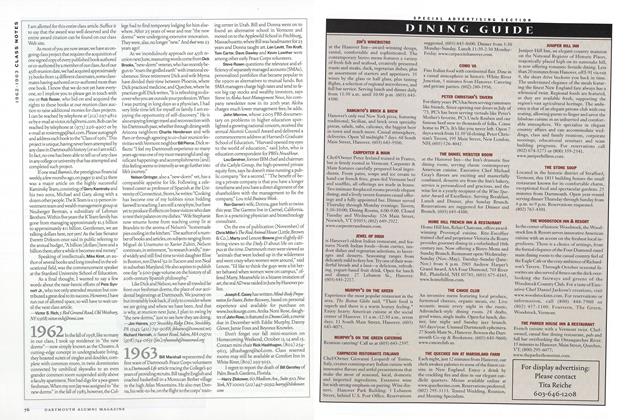 Bob Haubrich, Marty Bowne and I enjoy a lunch at Lou's before heading down to join Jerry Ashworth and other '63s for football against Harvard. (Dartmouth lost.) After the game Dan Muchinsky and Mary Barnes graciously open their home, as they often have, for drinks, dinner and fellowship. I run into Hank Rodgers; Dick and Pam Booma, who live in Lebanon, New Hampshire, where Dick runs Hanover Transfer & Storage, a North American Van Line agency; Cheryl and Bill Breetz, a Hartford, Connecticut, lawyer; Larry Stifler and Mary McFadden of Boston with Molly '14; Susan and Jim Higgins, a Manchester, New Hampshire, lawyer; Gayle and George Richardson, a Lynfield, Massachusetts, lawyer; George and Mary Jo Hellick, who were married their senior year at Dartmouth; Bob Chavey and Kerry Nix; Bruce and Phyllis Coggeshall; Steve and Ellen Kardon; Steve and Diana Lewinstein; Mike and Jeanne Prince; Bill and Sue Spencer; and Dick and Anne Swett.