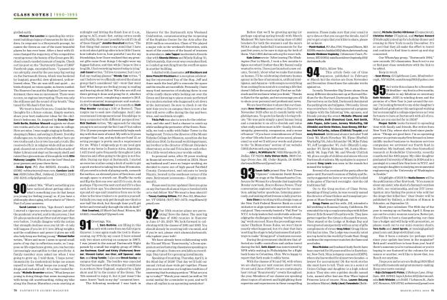 What's the best book you have read since our Dartmouth graduation in 1990 (Part II)? Kristin Jacobson: "Corelli's Mandolin by Louis DeBernieres, TheGoldfinch by Donna Tartt and Personal History by Katharine Graham." Greg Goldberg: "Death Comesfor the Archbishop by Willa Cather." Julie Urda: "Three books by Barbara Kingsolver: High Tidein Tucson made me appreciate and pursue better writing'; The Poisonwood Bible opened my eyes to the social, economic and political struggles in the world; and Animal, Vegetable, Miracle moved me to change my consumption habits to be more sus- tainable." Karen Behling: "The Orphan Master's Son by Adam Johnson. About North Korea, Pulitzer Prize-winner for fiction, a great story well told." David Sherwood: "A Guide to the SQL Stayidardhy Christopher J. Date. An obtuse primer on rela- tional databases, it made little sense to me my first pass through it, but my boss tossed it to me on our way to meet a new client and said, 'This is going to be important to you on this project,' and so it was. It helped define the next decade of my life." Richard Morris: "A Confederacy of Dunces, which had me laughing out loud in public places like no other book. I live in Brooklyn with my wife, Jessica, and 11-year old twins Charlie and Henry. To my pleasure, they both love baseball (and have more potential than I did) and I've enjoyed coaching' their teams since their early years." Ramzi Nemo: "The Work of Nations by Robert Reich '68." Kyle Davis: "The Benjamin Weaver series of books by David Liss chronicles the exploits of Weaver, a former champion pugilist in 18th-century London and Ashkenazi Jew." Sandy (Morton) Niles: "Life ofPi by Yann Martel, A Fine Balance by Rohinton Mistry and The Amazing Adventures ofKavalierandKlay by Michael Chabon." Brad Drazen: "DarkHarbor by David Hosp." Felicia Hwang Bishop: "Bora to Run by Christopher McDougall. I am now an injury-free, avid runner. I've started running com- petitively on the track and it's become a really enjoyable facet of my life." Mary (Bachman) DeSilva: "In the Night Kitchenby Maurice Sendak." Lauren Beiley: "The Brief Wondrous Life of Oscar Wao by Junot Diaz, recommended to me by Karen Euler." Jonathan Sullivan: "Getting Things Done by David Allen." Matt Nadler: "Catch-22 by Joseph Heller, with A Clockwork Orange by Anthony Burgess a close second. I am living in Chester, New Jersey, with my wife, Susan Klein, and our 5-year-old son. I work for Verizon and am responsible for long- term planning for all video products across our portfolio. Sue is a practicing vet, specializing in mobile ultrasound and internal medicine." Scott Schorer: "William Manchester's Last Lion series about Winston Churchill. Churchill is one of the few remaining examples of that great person who was able to transcend every obstacle and achieve great things for humanity." Todd Eckler: "Disrupting Class by Clayton Christensen. Ittalks about how integrating technology with traditional teaching can have a profound impact on learning."