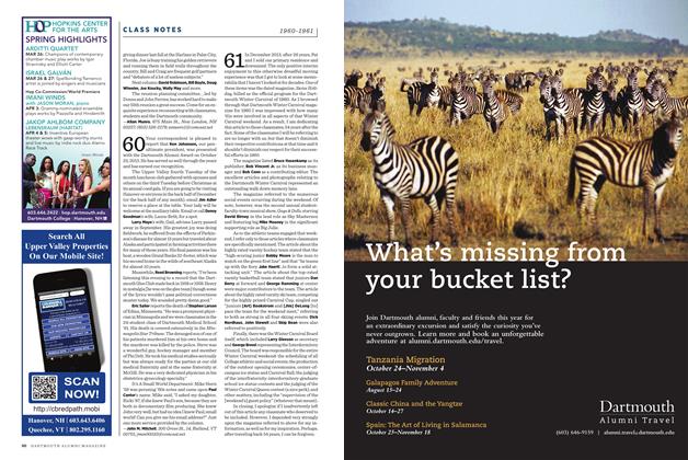 Jim Adler reports some impressive news: “This is to fill you in on the final results for our 55th reunion Dartmouth College Fund. Participa- tion amounted to 72.8 percent (426 donors), the highest participation rate of any reunion-year class, breaking the 55th reunion record held by the class of ’59 by 10 percentage points. Revenue of $1,207,229 broke the 55th reunion dollar record held by the class of ’53 by an amazing 21 percent. With 73 of us contributing $2,500 or more, we had the highest percentage of 1769 Society member- ship fund-wide at 12.48 percent. In short, we had the kind of remarkable year we and the College have come to expect. Thank you for being the classmates who made it all possible.”