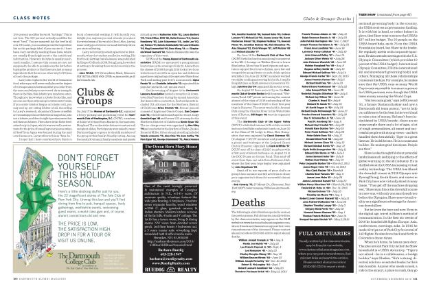 CAGOW provides opportunities for club officers to exchange ideas for club events, such as gatherings featuring the 62-minute docu- mentary Passion for Snow, produced by Stephen Waterhouse ’65, Tu’67, that presents more than 100 years of ski history in the United States and highlights the role played by Dartmouth and its alumni in developing the ski industry throughout the country.