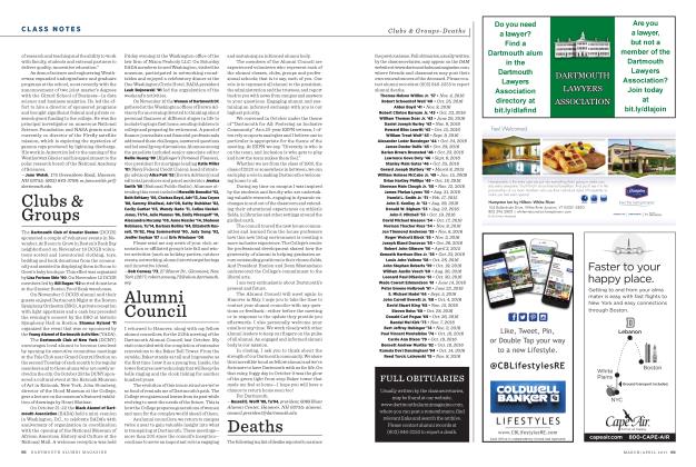 At Club and Affiliated Group Officers Week- end (CAGOW) on January 23-25 in Hanover club of the year awards went to the Dartmouth Club of Washington, D.C. (metro club), the Dartmouth Club of Philadelphia (large club) and the Dartmouth Club of Western Pennsylvania (medium club). The Dartmouth Club of Eastern Fairfield County and the Dartmouth Women’s Club of Boston shared the honors as small clubs of the year. The Dartmouth Uniformed Service Alumni received the Affiliated Group of the Year Award. The Club President of the Year Award went to Dimitri Gerakaris ’69 of the Dartmouth Club of the Upper Valley. S. Caroline Kerr ’05, president of the Dartmouth Gay, Lesbian, Bisexual and Transgender Alumni/ae Association (DGALA), was recognized as Group Officer of the Year. At CAGOW Cheri Comeau ’02, president of the Dartmouth Club of Central Massachusetts, was elected president of the Club Officers Associa- tion, succeeding Howard Hodel ’75, president of the Dartmouth Club of Hawaii.