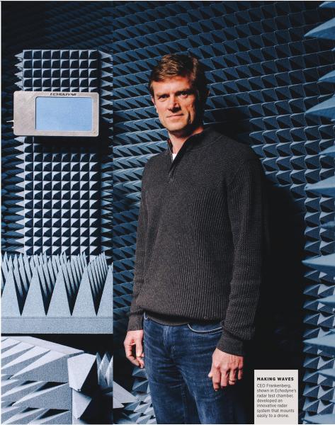 After a decade at Onyx, Frankenberg left to join Intellectual Ventures, an eclectic investment firm where his talent to move seamlessly across industries flourished. He helped start companies in industries ranging from cybersecurity to nuclear power before leaving in 2014 to cofound Echodyne and work fulltime on building better radar. “Echodyne was the fourth company that I worked on spinning out of Intellectual Ventures, and I really liked the mission,” Frankenberg says. “It’s very similar to the geophysics work I did, except it uses radio waves instead of soundwaves.”