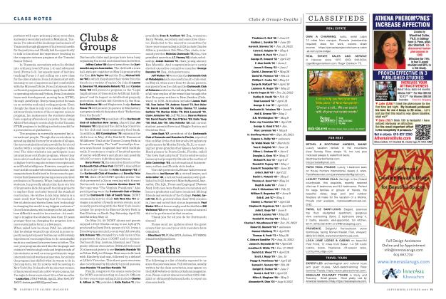 John Bash ’67, president of the Dartmouth Club of Sarasota and Manatee, Florida, reports that on December 15,2023, visiting English professor Donald Pease gave a brilliant presentation on “Turning Points in Dartmouth History.” Geologist Dave Dobson ’76 recalled his memories of President John Kemeny’s accomplishments, such as the D-Plan and coeducation. Economics professor Martin Zimmerman ’67 praised Kemeny’s contributions to mathematics and computer science. The club honored current students and recent graduates. Trevor Geyer ’26, a member of the Cherokee Nation, talked about the Native American program. Johnny Reid ’23 said he is now studying for an M.B.A. at the University of South Florida and enjoying his last year of eligibility to run track following his sterling record at Dartmouth. In addition, Circus Hall of Famer Paul Binder ’63 contrasted Dartmouth’s educational approach to the Middle East crisis to that of some of our peer institutions. Financier Mike Meehan ’72 announced his sponsorship of an essay contest for current Dartmouth students to provide recommendations for K-12 public education. Club members highlighted the football team’s co-championship and the selection of Sammy McCorkle as Ivy Coach of the Year. The club also acknowledged Dartmouth recipients of Rhodes and Marshall scholarships.