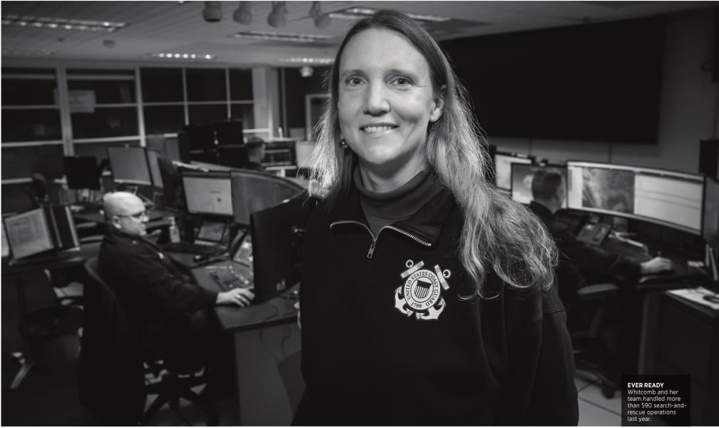 Whitcomb, manager of the Coast Guard’s search-andrescue (SAR) program for the state of Alaska, is used to getting distress calls at all hours. She serves, essentially, as the subject matter expert for the intense risk-reward calculus used in the most brutal of the Coast Guard’s nine SAR districts—nearly 4 million square miles of remote and weather-battered ocean stretching out through the Bering Sea and up to the North Pole. Kodiak, the branch’s westernmost jumping-off point for Jayhawk rescue helicopters and HC-130 Hercules fixed-wing aircraft, was calling Juneau for her advice.